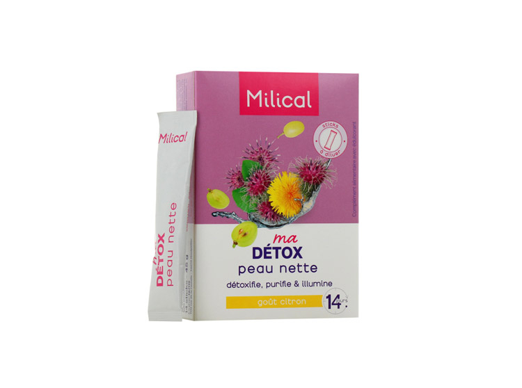 Milical Detox Peau Nette est un complément alimentaire associant le complexe breveté SkinAX²TM (pépins de raisin, SOD de melon, zinc et vitamine C), de la bardane et du pissenlit. Il exerce 3 grandes actions :
