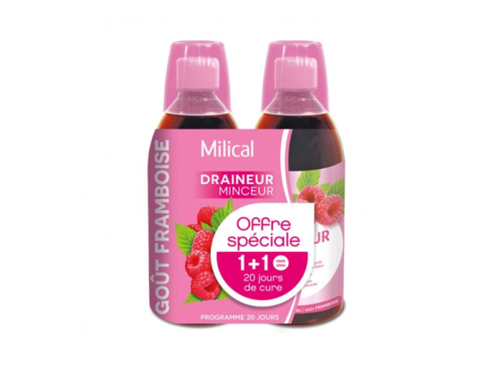 Le Draineur minceur Milical saveur framboise est une boisson à la formule unique d’extraits de 5 plantes reconnues pour affiner globalement la silhouette :