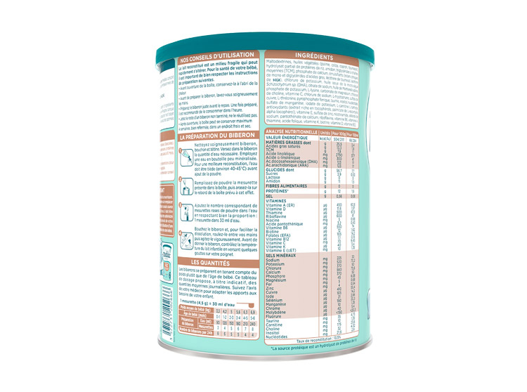 Maltodextrines, huiles végétales (palme, colza, coprah, tournesol), hydrolysat partiel de protéines de riz, amidon, phosphate de calcium, émulsifiants (esters citriques de mono et diglycérides d'acides gras, lécithine de tournesol, lécithine de soja), chlorure de potassium, phosphate de potassium, huile issue de la micro-algue Schizochytrium sp. (DHA), L-lysine, citrate de sodium, carbonate de magnésium, vitamine C, pyrophosphate ferrique, chlorure de sodium, L-tryptophane, L-thréonine, sulfate de cuivre, chlorure de choline, taurine, inositol, nucléotides, sulfate de manganèse, iodate de potassium, L-carnitine L-tartrate, antioxydants (extrait riche en tocophérols, palmitate de L-ascorbyle, alpha tocophérol), vitamine E, sulfate de zinc, nicotinamide, sélénite de sodium, pantothénate de calcium, riboflavine, vitamine B6, vitamine A, thiamine, acide folique, vitamine K, biotine, vitamine D, vitamine B12.