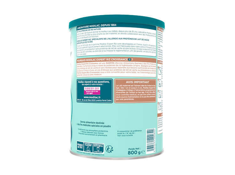 Depuis plus de 10, le savoir-faire unique sur l’allergie de Modilac a permis de développer le lait en poudre Modilac Expert Riz 3, une formule qui répond aux besoins nutritionnels du nourrisson de 12 à 36 mois, en cas d’allergie aux protéines de lait de vache et / ou d’intolérance au lactose.