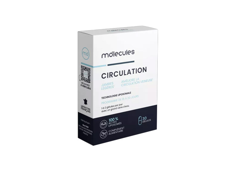Molecules Circulation est un complément alimentaire riche en flavonoïdes qui améliore la circulation veineuse chez les personnes ayant les jambes lourdes et douloureuses. Ce complément alimentaire améliore la circulation sanguine et lymphatique pour une action veinotonique renforcée qui aide à retrouver rapidement des jambes légères.