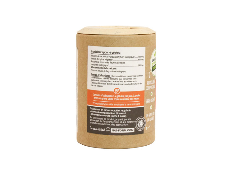 Complément alimentaire éco-responsable, complément alimentaire BIO, complément alimentaire vegan, Nat & Form complément alimentaire harpagophytum et reine des prés, complément alimentaire articulations, complément alimentaire confort articulaire, complément alimentaire douleurs articulaires.