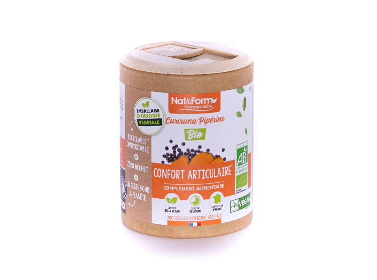 Complément alimentaire éco-responsable, complément alimentaire BIO, complément alimentaire vegan, Nat & Form complément alimentaire curcuma et pipérine BIO, complément alimentaire articulations, complément alimentaire confort articulaire.