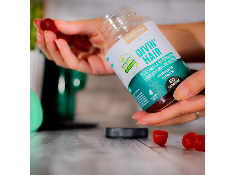 Complément alimentaire éco-responsable, complément alimentaire sans gluten, complément alimentaire kératine, Nat & Form complément alimentaire Divin'Hair, Nat & Form Splendid' Gummies Divin'Hair, complément alimentaire croissance des cheveux, complément alimentaire pousse des cheveux, complément alimentaire cheveux et ongles, gummies croissance des cheveux, gummies Nat & Form pour les cheveux.