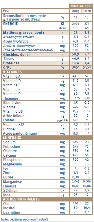 Le lait Novalac BIO 1 contient du DHA (acide docosahexaénoïque), un acide gras polyinsaturé à longue chaîne de la famille des Oméga-3, comme l'exige le règlement pour toutes les préparations en poudre pour nourrissons.