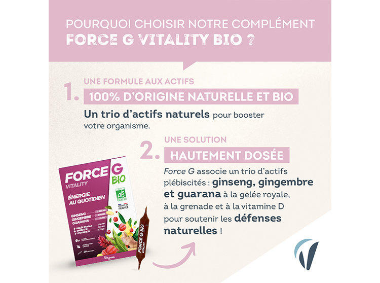 1 ampoule apporte 3 500 mg de Ginseng, 800 mg de Gingembre, 187 mg de Guarana dont 15 mg de caféine, 200 mg de Gelée Royale, 100 mg de jus concentré de Grenade bio, 900 µg d'extrait de Lichen Bio dont 0,75 µg (15% VNR*) de Vitamine D.
