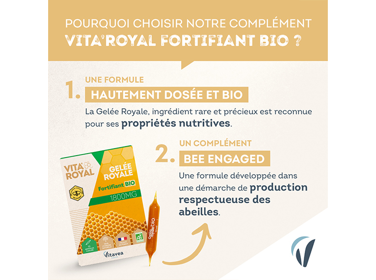 La Gelée royale Bio Nutrisanté est un concentré nutritif fortifiant hautement dosé : 1 ampoule apporte 1800 mg de gelée royale bio.