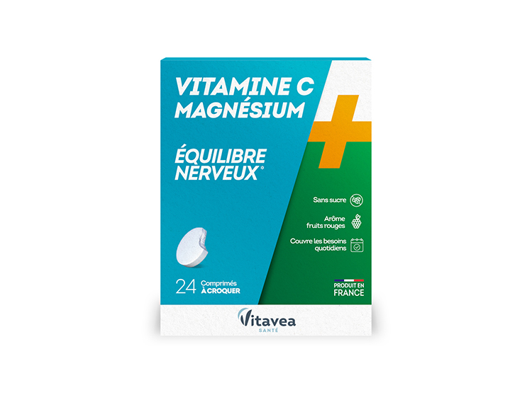 La vitamine C contribue à la réduction de la fatigue. Grâce à ses différentes actions : elle contribue au métabolisme énergétique, elle aide à réduire la fatigue, elle permet le maintien du bon fonctionnement du système immunitaire pour assurer les défenses de l’organisme, antioxydante, elle protège les cellules contre le stress oxydatif. Le magnésium est un élément minéral intervenant dans de nombreuses réactions biochimiques au sein de l’organisme. Il participe au bon fonctionnement du système nerveux, aide à réduire la fatigue et favorise ainsi la détente et la relaxation.