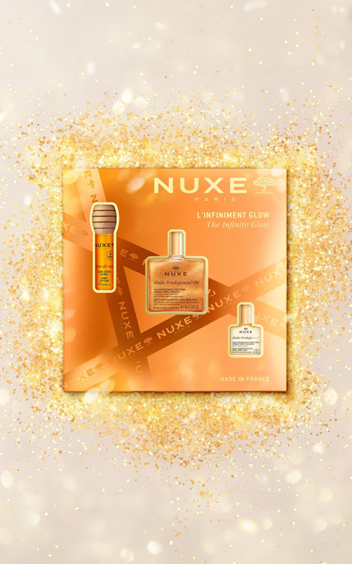 1/ Des soins iconiques pour sublimer l'éclatLe coffret rassemble trois incontournables Nuxe, formulés pour nourrir et illuminer la peau : - Huile Prodigieuse® Or : l’incontournable huile sèche sublimatrice enrichie en nacres dorées, pour nourrir et apporter un éclat irisé à la peau et aux cheveux. - Huile Prodigieuse® : la version classique en format 10 ml, parfaite à emporter partout pour hydrater visage, corps et cheveux. - Rêve de Miel Soin Lèvres : un baume au miel qui répare, nourrit et protège les lèvres sèches, pour un sourire doux et lumineux.