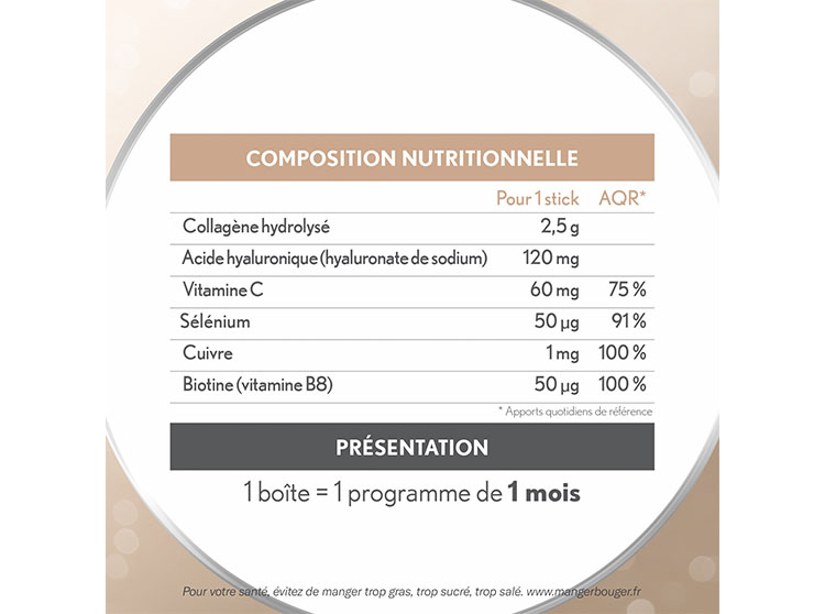 Maltodextrine, collagène hydrolysé (VERISOL®), arôme mangue, acidifiant (acide citrique), hyaluronate de sodium, arôme maracuya, acide ascorbique, arôme ananas, édulcorant (glycosides de stéviol), L-sélénométhionine, gluconate de cuivre, colorants (anthocyanes, curcumine), biotine.