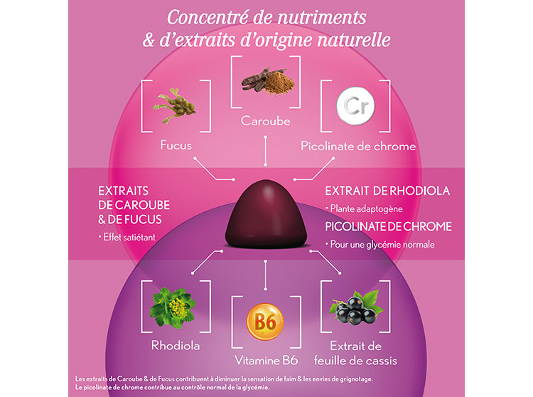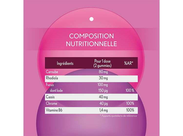 Agent de charge : maltitol – extrait sec de thalle de fucus (Fucus vesiculosus L.) - arôme naturel - extrait sec de fruit de caroube(Ceratonia siliqua L.) - agent gélifiant : pectine - extrait sec de feuille de cassis (Ribes nigrum L.) - agent acidifiant : acide citrique - extrait sec de racine de rhodiola (Rhodolia rosea) - agent acidifiant : citrate de sodium - concentré (carotte & cassis) - agent d’enrobage : cire de carnauba - chlorhydrate de pyridoxine (vitamine B6) - picolinate de chrome. Caroube, Rhodiola, Fucus, Cassis : origine non UE.