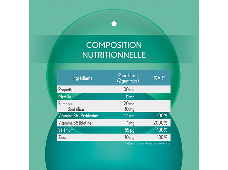 Agent de charge : maltitol - extrait sec de partie aérienne de roquette (Eruca vesicaria L.) - agent gélifiant : pectine - agent acidifiant : acide citrique - citrate de zinc - extrait sec d'exsudat de bambou (Bambusa arundinacea) - arôme naturel - agent acidifiant : citrate de sodium - extrait sec de feuille de myrtille (Vaccinium myrtillus L.) – L-sélénométhionine (sélénium) - concentré (carotte & cassis) - agent d’enrobage : cire de carnauba - chlorhydrate de pyridoxine (vitamine B6) - biotine (vitamine B8).