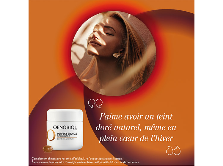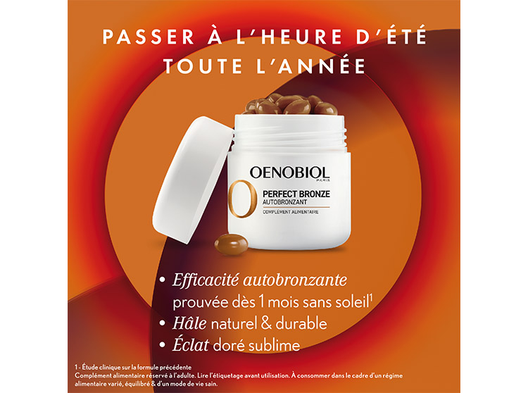PERFECT BRONZE Autobronzant d'Oenobiol vous permet de profiter d'un teint hâlé et lumineux tout au long de l'année, sans les risques liés à l'exposition solaire. Ce complément alimentaire innovant, formulé à partir de pigments 100% d'origine végétale, garantit des résultats visibles dès le premier mois pour un bronzage naturel, uniforme et durable.