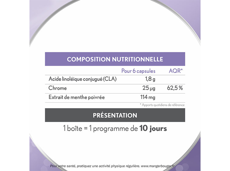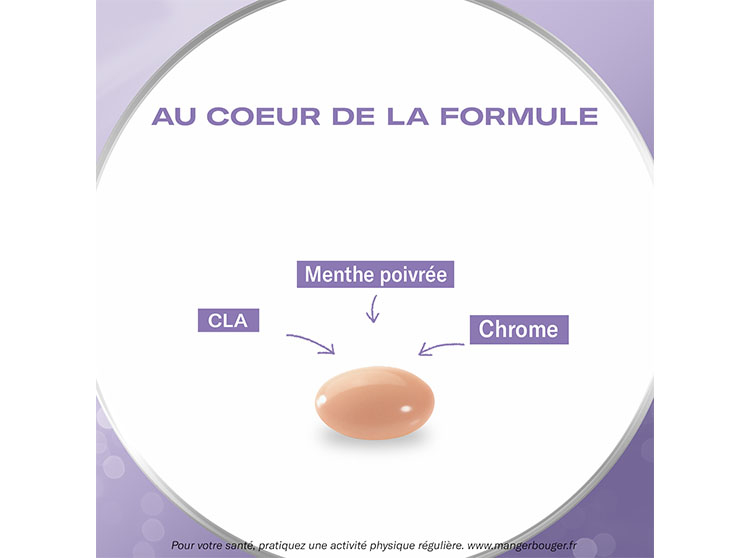 Acide linoléique conjugué (CLA), gélatine, émulsifiant (stéarates de glycérol), agent d’enrobage (glycérol), eau, extrait de menthe poivrée (Mentha x piperita L.), agent d’enrobage (sorbitol), antiagglomérant (dioxyde de silicium [nano]), émulsifiant (lécithine de tournesol), chlorure de chrome, colorant (oxyde de fer).