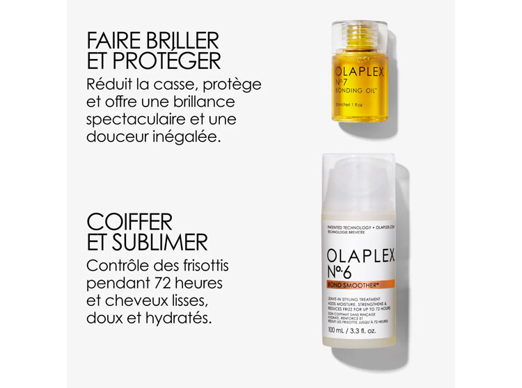 Nº.6 Bond Smoother® (3,3 oz fl. oz. / 100mL) : Water (eau), Cetearyl alcohol (alcool cétéarylique), Dimethicone (diméthicone), Isohexadecane, Coco-Caprylate (huile estérifiée de coco), Neopentyl Glycol Diheptanoate, Behentrimonium Chloride (chlorure de behentrimonium), Isododecane, Phenyl Trimethicone (phényltriméthicone), Propanediol, Bis-Aminopropyl Diglycol Dimaleate (dimaléate de bis-aminopropyl diglycol), Fragrance (parfum), Cetrimonium chloride (chlorure de cétrimonium), Phenoxyethanol (phénoxyéthanol), Glyceryl Stearate (stéarate de glycéryle), Isopropyl Alcohol (alcool d’isopropyle), Hydroxyethylcellulose (hydroxyéthylcellulose), Hydroxypropyl guar (dérivé de gomme de guar), Sodium Stearoyl Lactylate, Hydroxypropyl Cyclodextrin, Hexyl Cinnamal, Limonene (limonène), Citral, hydrolyzed vegetable protein PG-propyl silanetriol (protéines végétales hydrolysées PG-propyl Silanetriol), Disodium EDTA (EDTA disodique), Linalool (linalol), Citronellol, Iodopropynyl Butylcarbamate (Butylcarbamate d’iodopropynyle), Hydroxycitronellal, Etidronic acid (acide étidronique), Tocopherol (tocophérol), Geraniol (géraniol), Potassium sorbate (sorbate de potassium), Helianthus Annuus Seed Oil (huile de graines de tournesol), Phytantriol, Sodium benzoate (benzoate de sodium), Pseudozyma Epicola/Camellia Sinensis Seed Oil Ferment Extract Filtrate (huile fermentée de graines de thé vert), Tocopheryl acetate (acétate de vitamine E), Vitis Vinifera Seed Oil (huile de graine de raisin), Aloe Barbadensis Leaf Juice (jus de feuilles d’aloès), Panthenol (panthénol), Citric acid (acide citrique), Gigartina stellata extract (extrait de Gigartina Stellata, Chondrus Crispus (Carrageenan) Extract (extrait de carraghénane), Ascorbic acid (acide ascorbique), Cocos Nucifera (Coconut) Oil (huile de noix de coco)