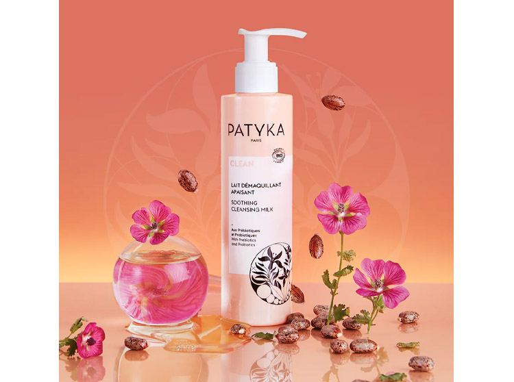 Enrichi en eau florale de mauve bio, et prébiotiques et en probiotiques, le lait démaquillant apaisant BIO Patyka Clean calme les rougeurs et les sensations d'échauffement tout en renforçant le microbiote cutané.