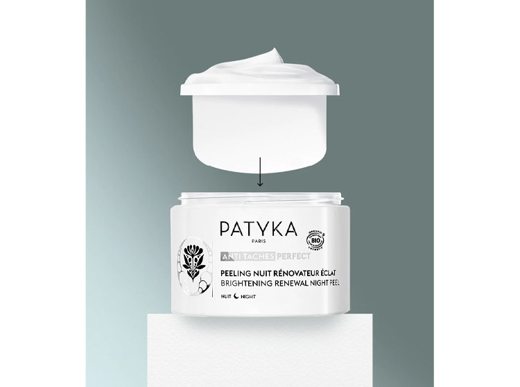 Inspirée des peelings dermatologiques, la Recherche Avancée PATYKA a mis au point le soin de nuit Anti-Taches Perfect Peeling Nuit rénovateur Eclat BIO qui associe le pouvoir éclaircissant de la Fougère des Mers à une très haute concentration d’AHA (8%) pour accélérer l’élimination des taches, booster l’éclat de la peau et révéler un teint uniforme et lumineux nuit après nuit.