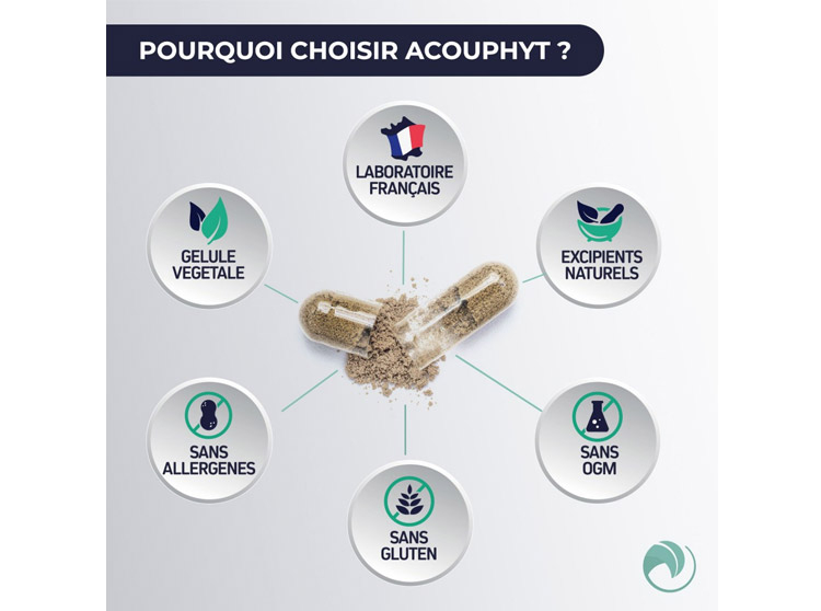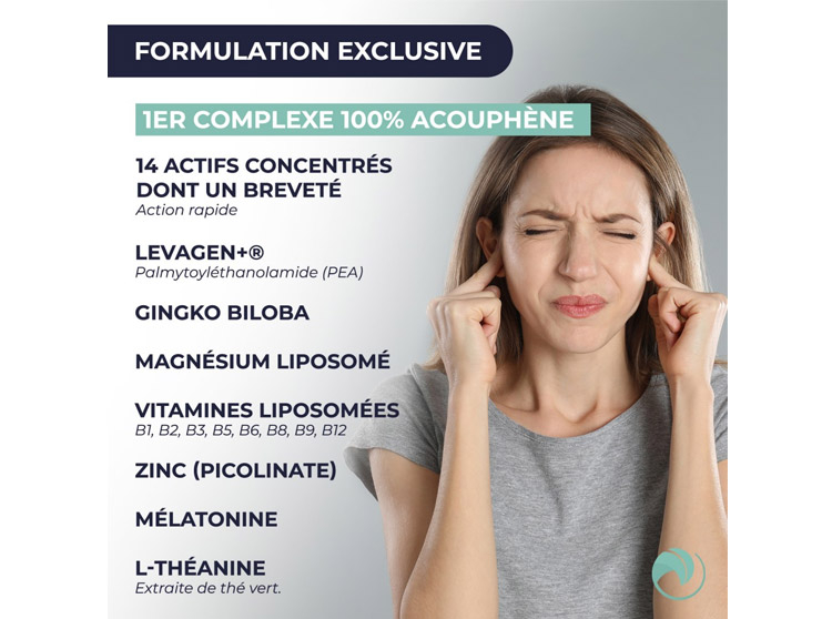 Acouphyt est un complément alimentaire à base d'extraits de plantes, de palmitoyéthanolamide, de L-Théanine, de mélatonine, de vitamines et de minéraux :