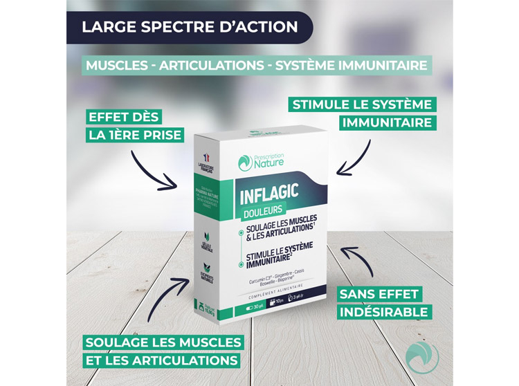 Le complément alimentaire Inflagic double action anti-inflammatoire permet de soulager les douleurs inflammatoires, les douleurs musculaires et articulaires.