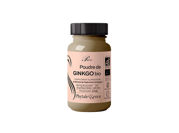 Phytalessence Pure Extrait sec de Ginkgo BIO est un complément alimentaire formulé à base de ginkgo BIO. Le ginkgo est une plante riche en antioxydant qui permet de protéger les cellules du vieillissement et ainsi protéger du déclin cognitif. Le ginkgo participe également à la bonne vascularisation et au soutien des fonctions cognitive et de la mémoire. Ce plante est également connue pour agir sur les douleurs prémenstruelles.