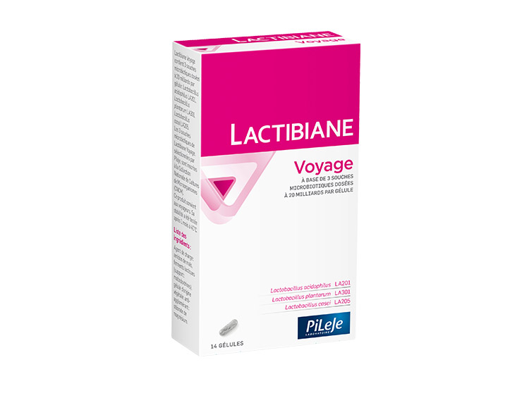 Lactibiane Voyage est un complément alimentaire à base de 3 souches microbiotiques dosées à 20 milliards par gélule