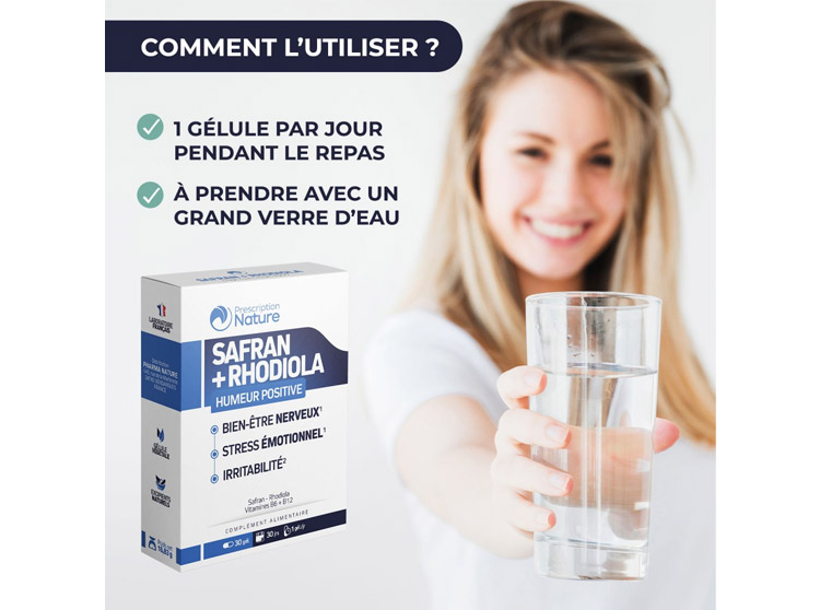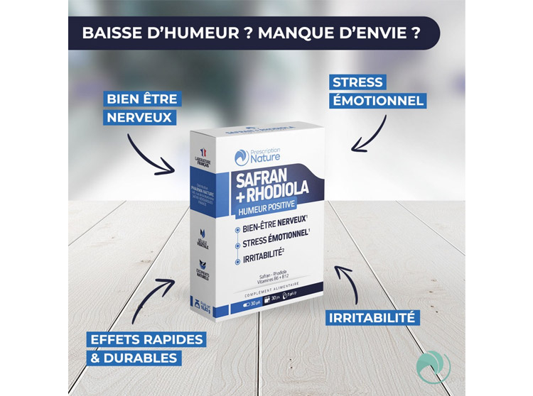SAFRAN+RHODIOLA est un complément alimentaire composé d'extraits de stigmates de safran, de racines de rhodhiola et de vitamines qui contribuent :