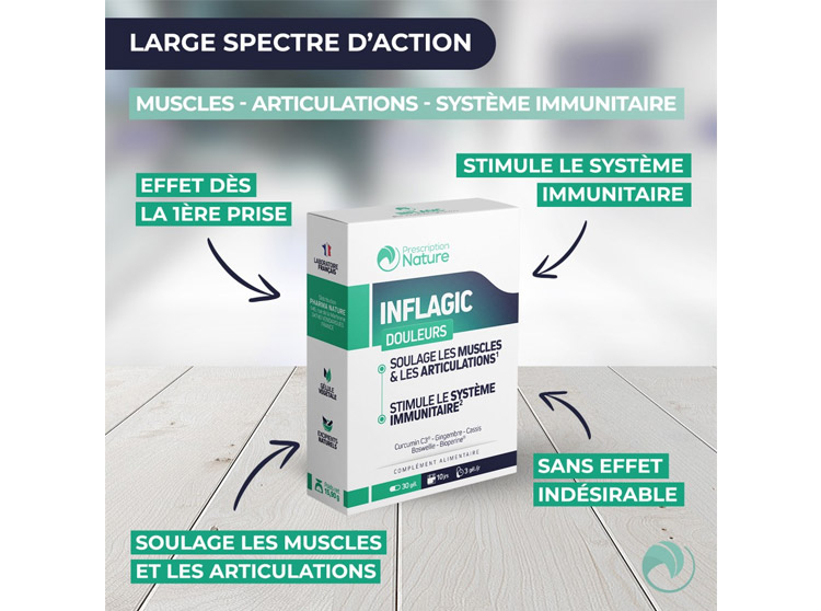 Le complément alimentaire Inflagic permet de soulager les douleurs inflammatoires, les douleurs musculaires et articulaires.