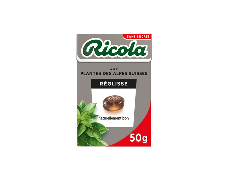 Les bonbons Ricola Réglisse sans sucres associent nos 13 plantes des Alpes suisses à la réglisse pour une expérience gustative unique et un goût parfumé en anis.