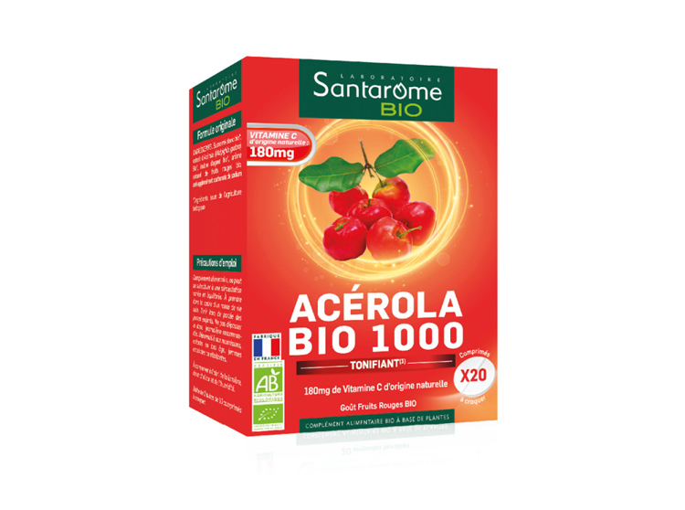 L'acérola 1000 de Santarome BIO est un complément alimentaire naturellement riche en vitamine C. Il permet de réduire la fatigue et de faire fonctionner normalement le système nerveux et immunitaire. Ces comprimés ont un bon goût de fruits rouges.