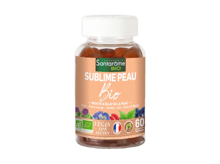 Retrouvez une peau nette et lumineuse* avec les gummies Sublime Peau Bio, les gummies 100% Bio de Santarome Bio. Au bon goût de Sureau. Cette formule est composée d'Ortie, riche en silicium, qui contribue à une peau nette. La pensée sauvage, riche en flavonoïdes et tanins limite la production de sébum et purifie la peau. La Bardane adoucit et apaise la peau. Enfin, le Raisin et le Goji sont riches en antioxydants pour lutter contre le vieillissement cutané. Nos gummies sont 100% Bio, 100% végan, sans gluten, fabriqués en France et enrichis en bourgeons Bio. Pour une efficacité renforcée, cette formule est complétée par un trio de bourgeons Bio : Chêne, Orme blanc, Cassis.