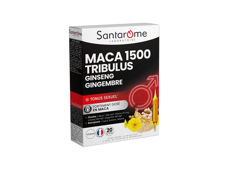 MACA 1500 TRIBULUS GINSENG GINGEMBRE - 20 ampoules est une formule à base de 4 plantes : Maca, Tribulus terrestre, Ginseng et Gingembre.