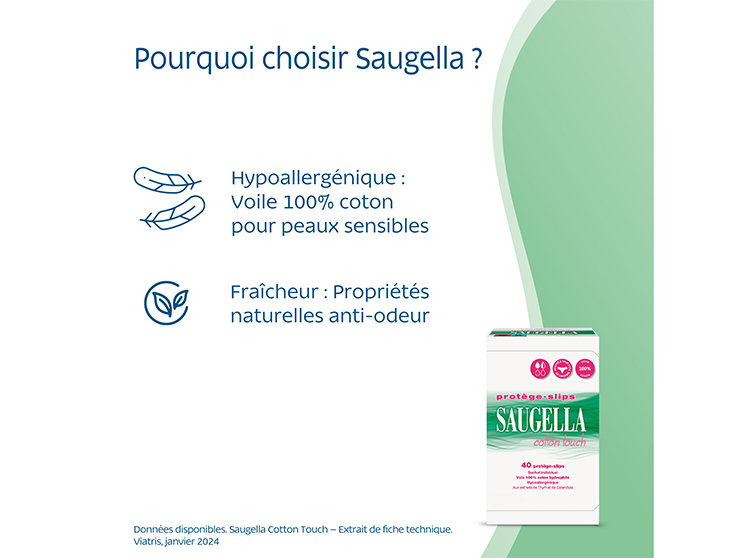 Avez-vous déjà ressenti un léger inconfort au cours d'une journée bien remplie, en souhaitant un protège-slip à la fois confortable et efficace ? Découvrez Saugella Cotton Touch, des protections quotidiennes pensées pour s'intégrer facilement à votre routine. Dotés d'un voile extérieur 100 % coton, ces protège-slips doux sont hypoallergéniques et adaptés aux peaux les plus peaux sensibles.