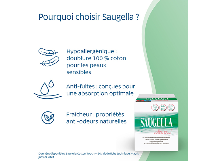 Hypoallergénique : Serviettes hygiéniques pour femmes avec un voile 100 % coton, adaptées même aux peaux les plus sensibles. Les serviettes Saugella ne contiennent pas de parfums artificiels ; leur parfum naturel et distinctif provient de l'extrait de thym.