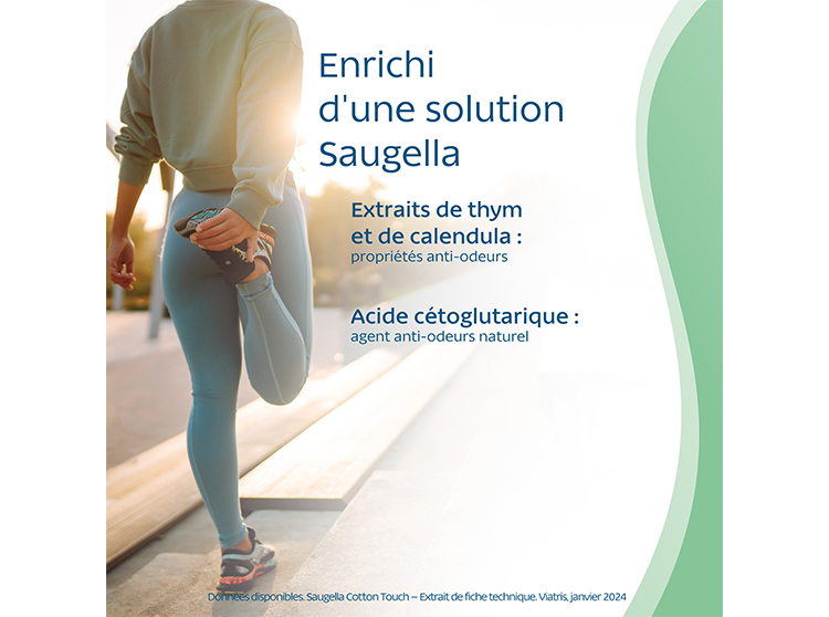 Solution Saugella : Serviettes hygiéniques avec des extraits de thym et de calendula, ainsi que de l’acide cétoglutarique offrant des effets anti-odeurs.