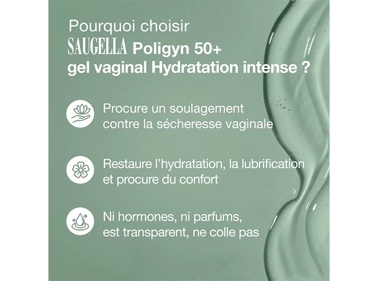 Saugella Poligyn 50+ Gel Vaginal Hydratation Intense est un lubrifiant intravaginal sans hormones, spécialement formulé pour répondre aux besoins des femmes de 50 ans et plus. Il aide à soulager efficacement la sécheresse vaginale liée à la ménopause, ainsi que les sensations d’irritation, de brûlure et d’inconfort intime.