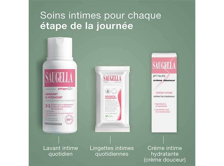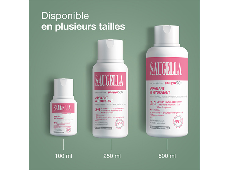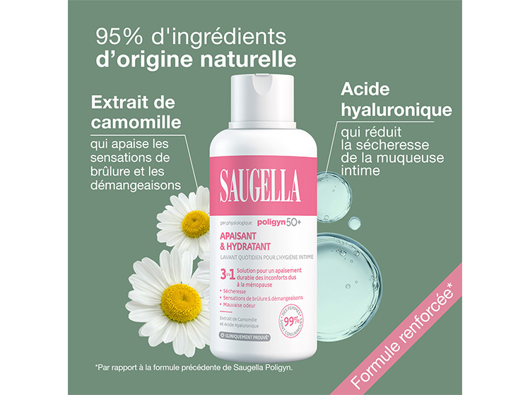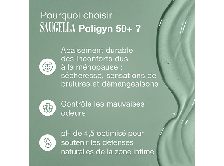 Un soin ciblé pour les inconforts intimes de la ménopause Saugella Poligyn 50+ est un nettoyant intime doux, spécialement conçu pour les femmes de 50 ans et plus. Son action 3-en-1 cliniquement prouvée apporte un apaisement durable de la sécheresse, des sensations de brûlure, des démangeaisons et des mauvaises odeurs, fréquents pendant la ménopause. Grâce à sa formule et à son pH équilibré de 4,5, il aide à restaurer le confort intime et l’hydratation physiologique tout en préservant les défenses naturelles de la zone vulvaire.