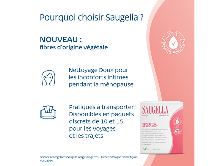 Découvrez les lingettes Saugella Poligyn Confort et apaisement, spécialement conçues pour répondre aux besoins intimes des femmes matures en déplacement.