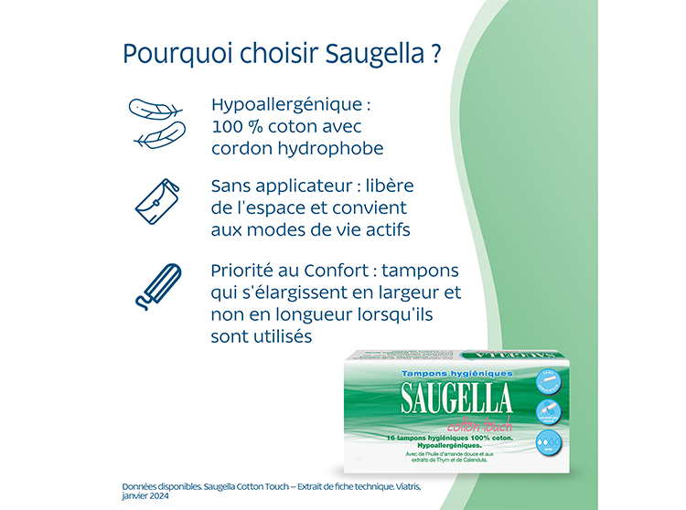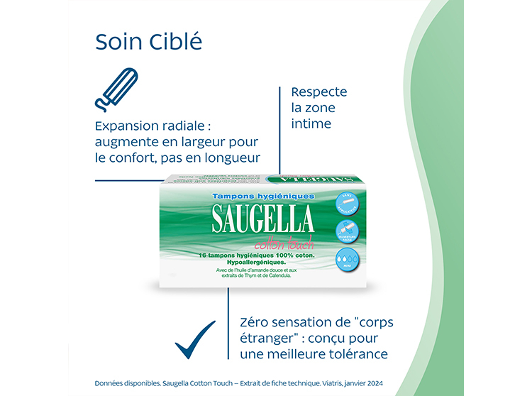 Flux légers : Les tampons hygiéniques Saugella Cotton Touch sont les tampons doux & idéaux, spécialement conçus pour les flux légers et parfaitement adaptés aux jeunes femmes.