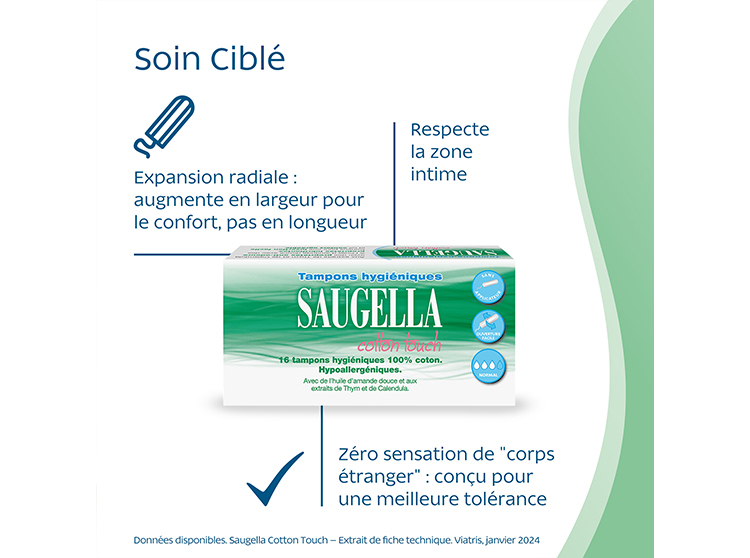 Flux normaux : Les tampons hygiéniques Saugella Cotton Touch sont les tampons doux & idéaux, spécialement conçus pour les flux normaux et parfaitement adaptés aux jeunes femmes.