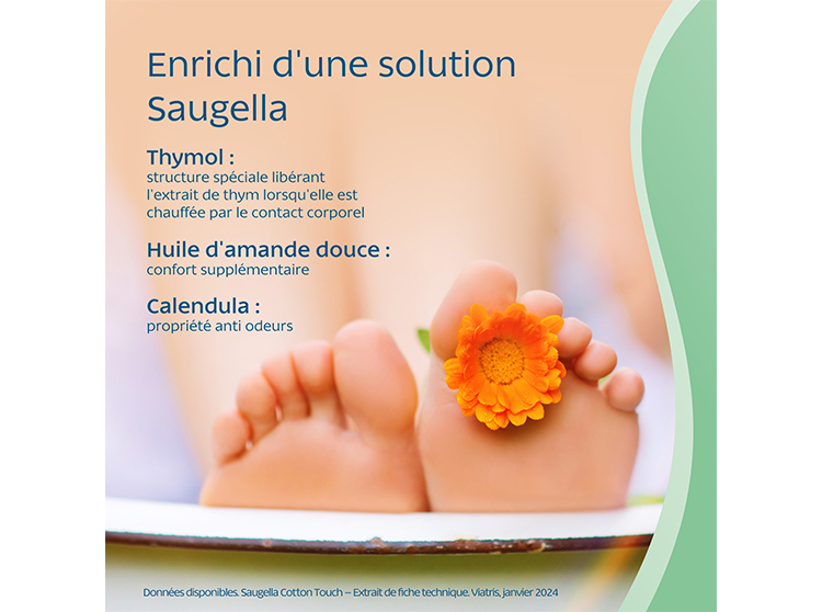 Formule enrichie : Les tampons Saugella Cotton Touch sont enrichis en extraits de Thym et de Calendula, pour leurs propriétés anti-odeurs, ainsi qu'en huile d'amande douce pour un confort supplémentaire.