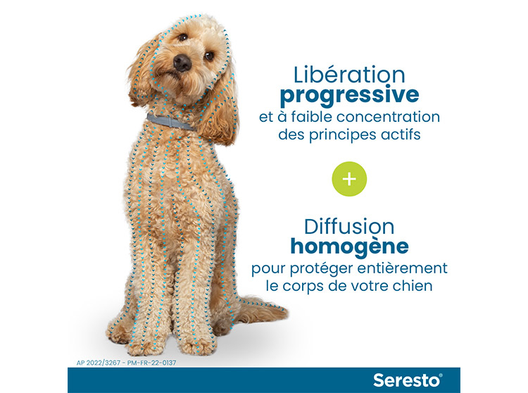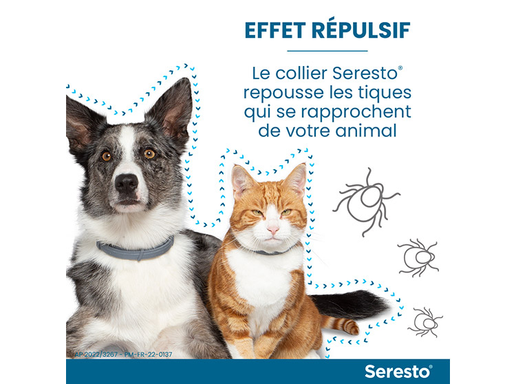 SERESTO® Chats, SERESTO® Petits Chiens, SERESTO® Grand Chiens sont des médicaments vétérinaires. Lisez attentivement la notice avant utilisation. Demandez conseil à votre professionnel de santé animal/ vétérinaire/ pharmacien. Si les symptômes persistent, consultez votre vétérinaire.