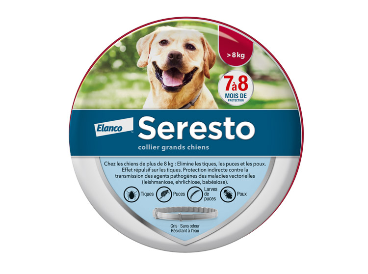 Le collier existe en deux présentations ajustables : petit (pour les chiens jusqu’à 8 kg) et grand (pour les chiens de plus de 8 kg). Le collier Seresto grands chiens est indiqué pour les chiens de plus de 8 kg. Compte tenu de sa longueur, le collier ne sera pas adapté aux très grands chiens dont le tour de cou dépasse 65 cm. En cas de doute sur l’utilisation du collier sur votre chien, consultez votre vétérinaire.