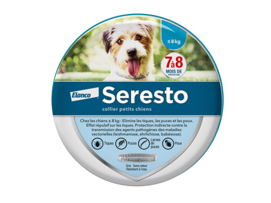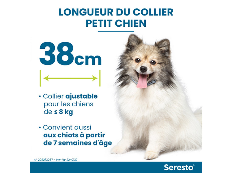 Le collier antiparasitaire Seresto Petits chiens est ajustable et compatible avec toutes les races de chiens de petite taille. Ce collier de protection pour chien de moins de 8kg protège vos animaux de compagnie pendant 7 à 8 mois contre les puces et les tiques.