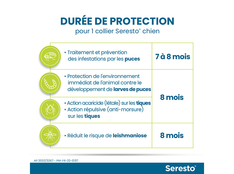 Le collier antiparasitaire Seresto élimine les puces et les tiques par simple contact, ce qui signifie qu’elles n'ont pas à mordre ou piquer votre chien pour être neutralisé. Grâce à sa diffusion progressive, ce collier antiparasitaire génère une couche de protection invisible qui repousse, élimine et tue les puces et les piques sans laisser d’odeur ni de résidu collant sur les poils de votre chien.