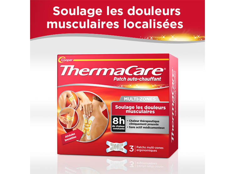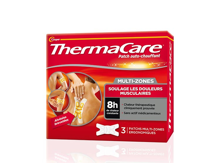 ThermaCare Patch Auto-Chauffant 8h Multi-Zones 3 Patchs sont des patchs auto-chauffant que vous pourrez appliquer sur plusieurs zones endolories de votre corps (dos, bras, mollet, etc.) Ces patchs auto-chauffant vous procurent un soulagement efficace et ciblé des zones sous tensions musculaires de votre corps. Un patch vous offrira une chaleur constante durant 8h non-stop. Son format ergonomique vous permettra de l'appliquer sur diverses parties de votre corps que ce soit votre dos, vos jambes, etc. Le patch ThermaCare est à usage unique et ne comporte pas d'actif médicamenteux.