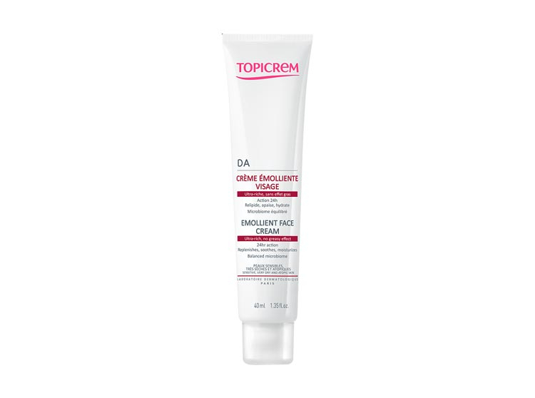 La Crème DA Emolliente visage de Topicrem relipide apaise et hydrate les peaux sensibles, sèches à atopiques, ultra riche elle diminue les grattages et irritations pour apporter jusqu'à 24h d'hydatation à la peau.