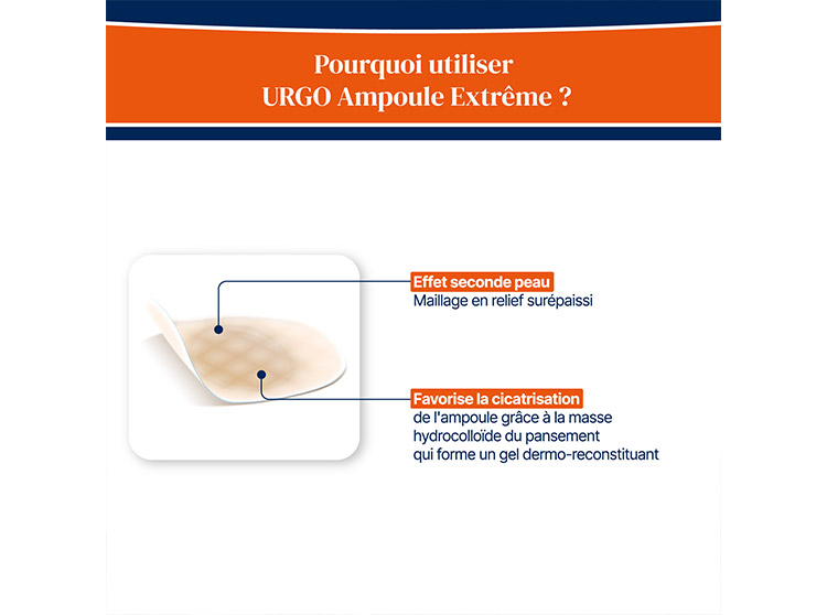 Les pansements Ampoules extrêmes sont conçu pour une tenue renforcée, et pour soulager la douleur. Le maillage en relief surépaissi réparti sur l’ensemble de ce pansement grand format isole les ampoules des pressions et des frottements. La masse hydrocolloïde du pansement forme un gel dermo-reconstituant qui favorise la cicatrisation de l’ampoule de grande taille. Urgo Ampoule Extrême s’adapte de façon optimale à la forme du pied.