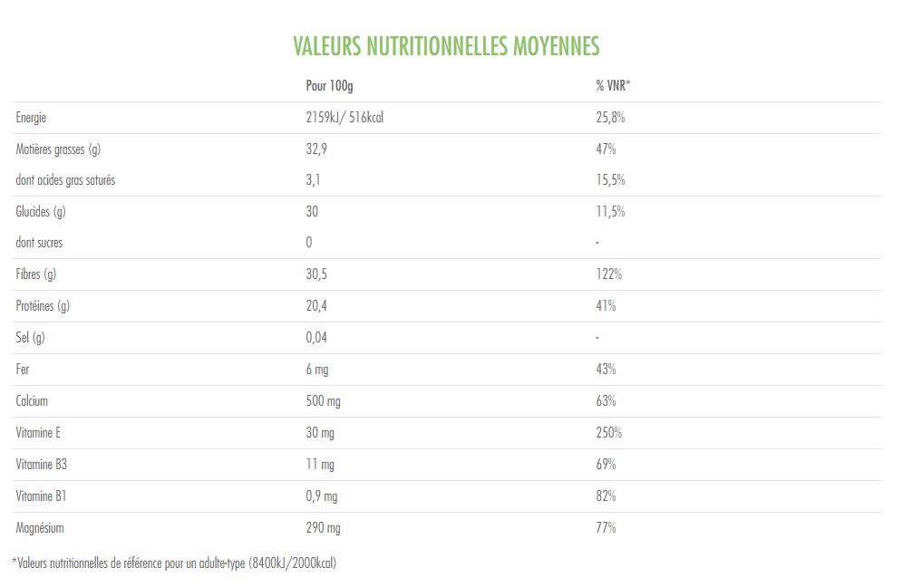Intérêts : Riche en oméga 3 et 6 luttant contre les risques cardiovasculaires.