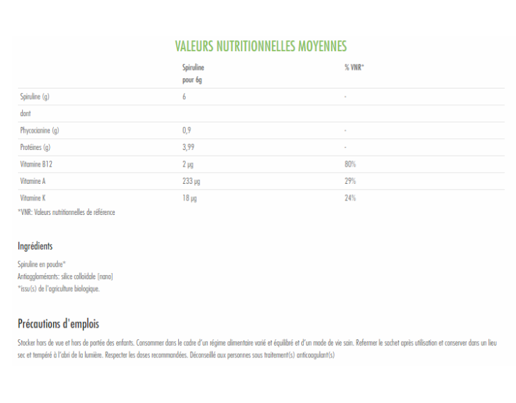 20.9% de Phycocyanines brutes (Pigment)Goût caractéristique