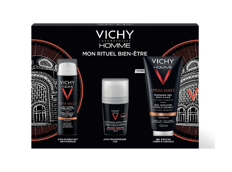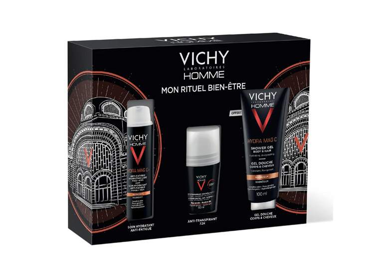 Le coffret Rituel Bien-Être pour hommes conçu par Vichy sera l'allié idéal des hommes souhaitant prendre soin de leur peau. Il offre une routine de trois soins essentiels, autant pour le corps que le visage : le Gel Douche Corps et Cheveux, le Soin Anti-Fatigue Yeux et Visage, ainsi que le Déodorant 72h Anti-Transpirant. Ensemble, ces produits prennent soin de vous et de votre bien-être, le tout en vous conférant un moment de détente exceptionnel.
